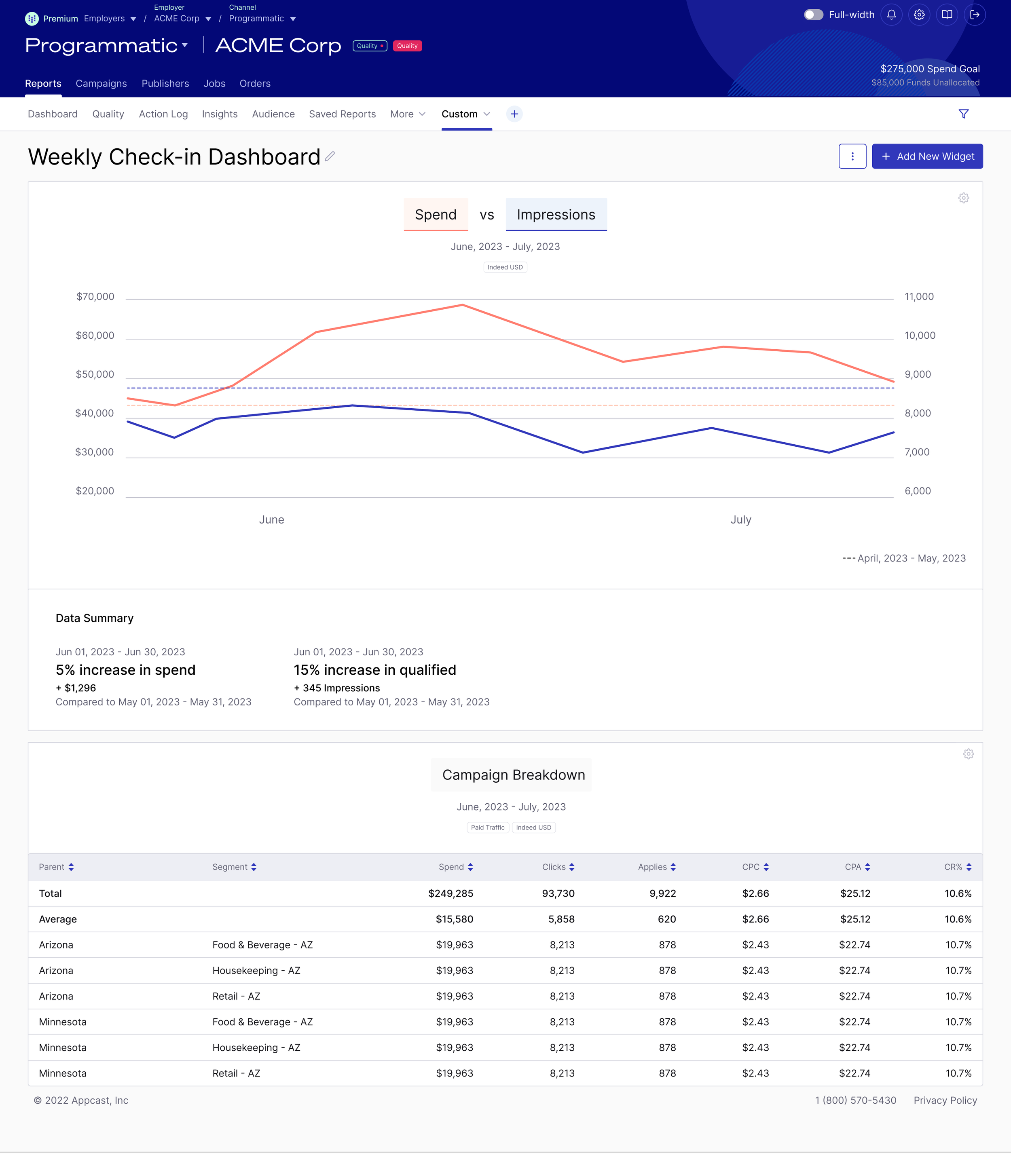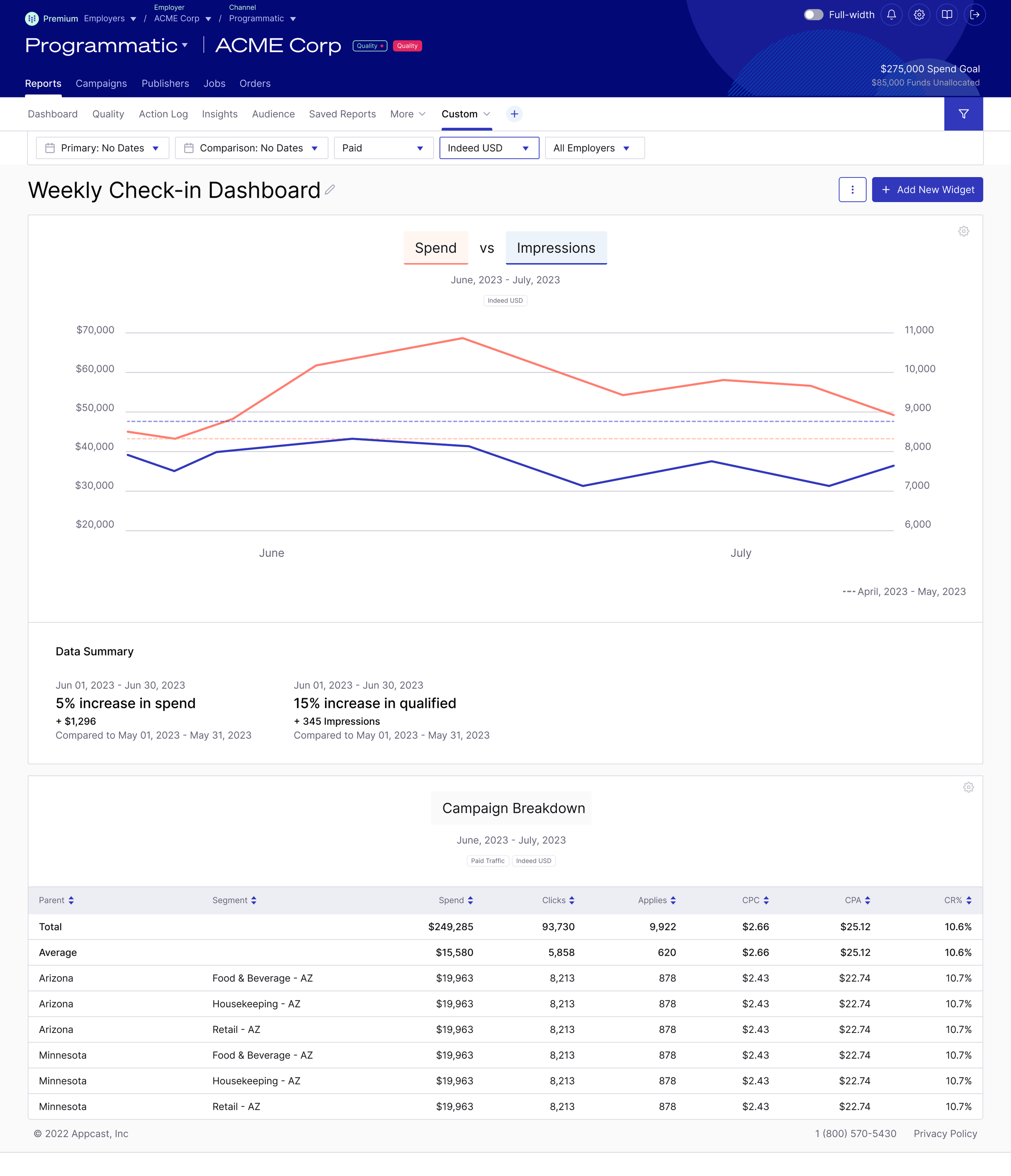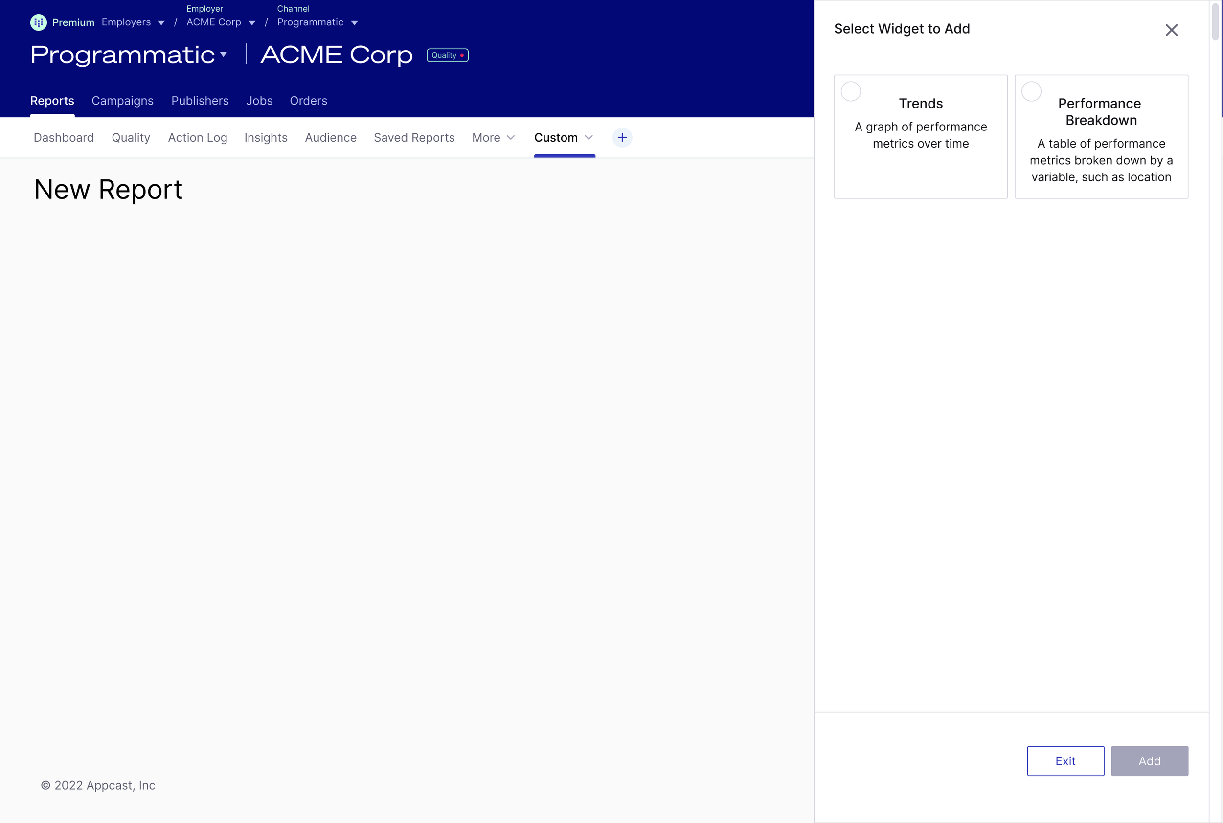 Appcast’s customers wanted Appcast to make hires cheaper and faster. Customers would determine how well Appcast is meeting their goals with performance reporting. Each customer had different circumstances, needs, and demands. Appcast account teams spent 30% of their time creating customized customer-facing reporting in and out of the product. The quality and formatting of the reporting was dramatically inconsistent across customers. The product was too rigid and “one size fits none” for it to fully meet the needs of Appcast account teams and customers.