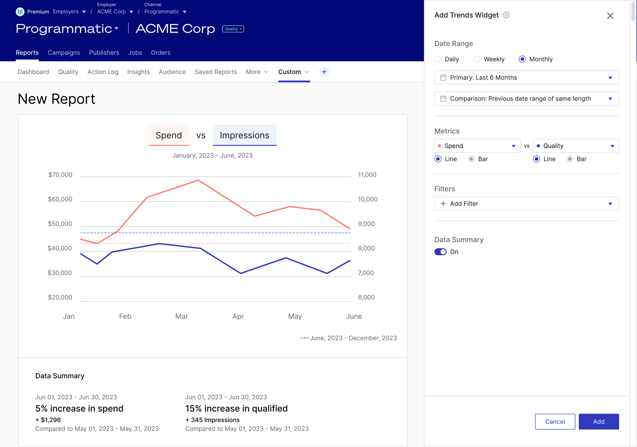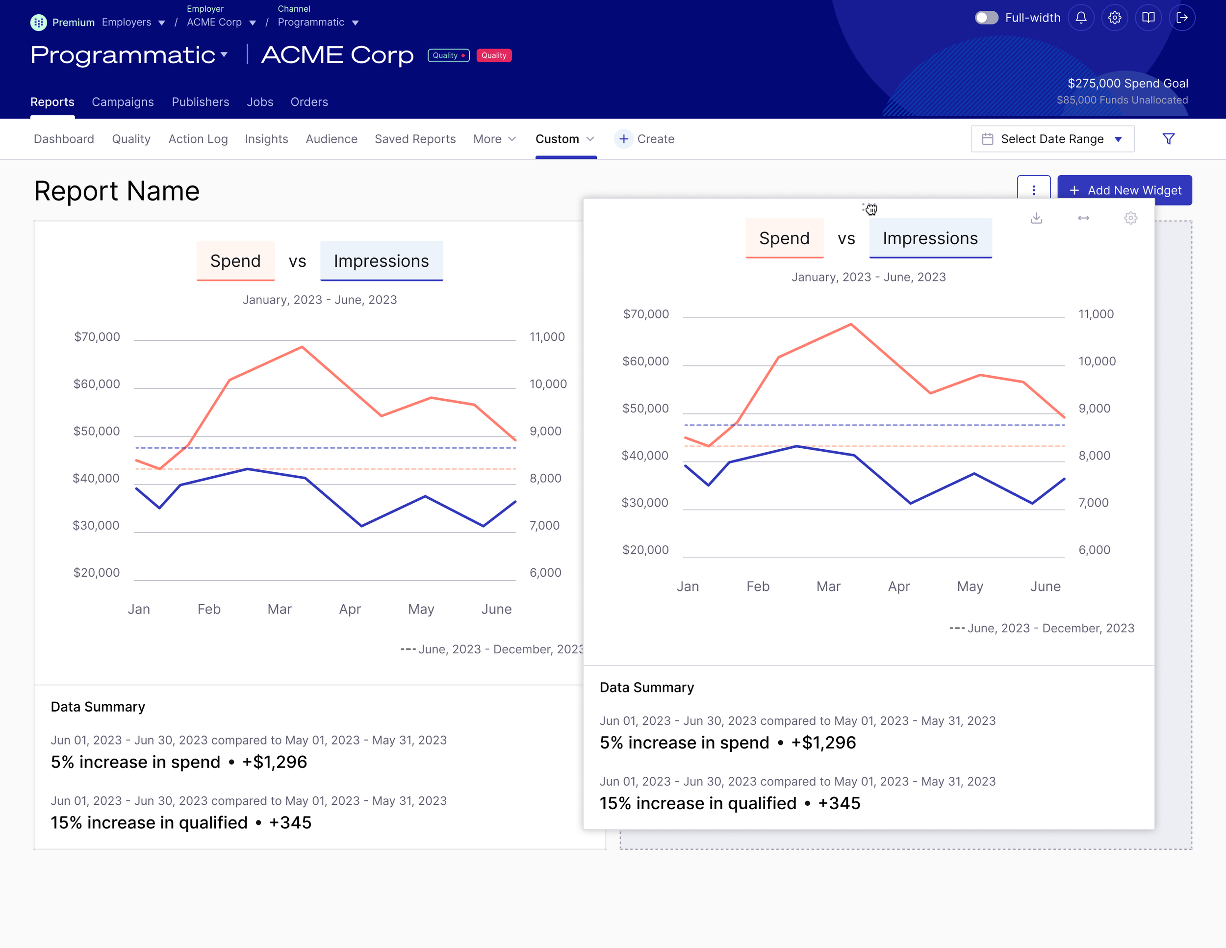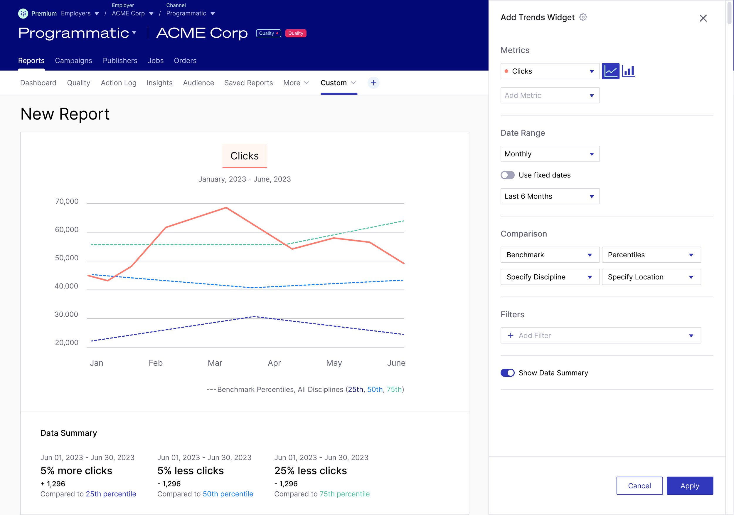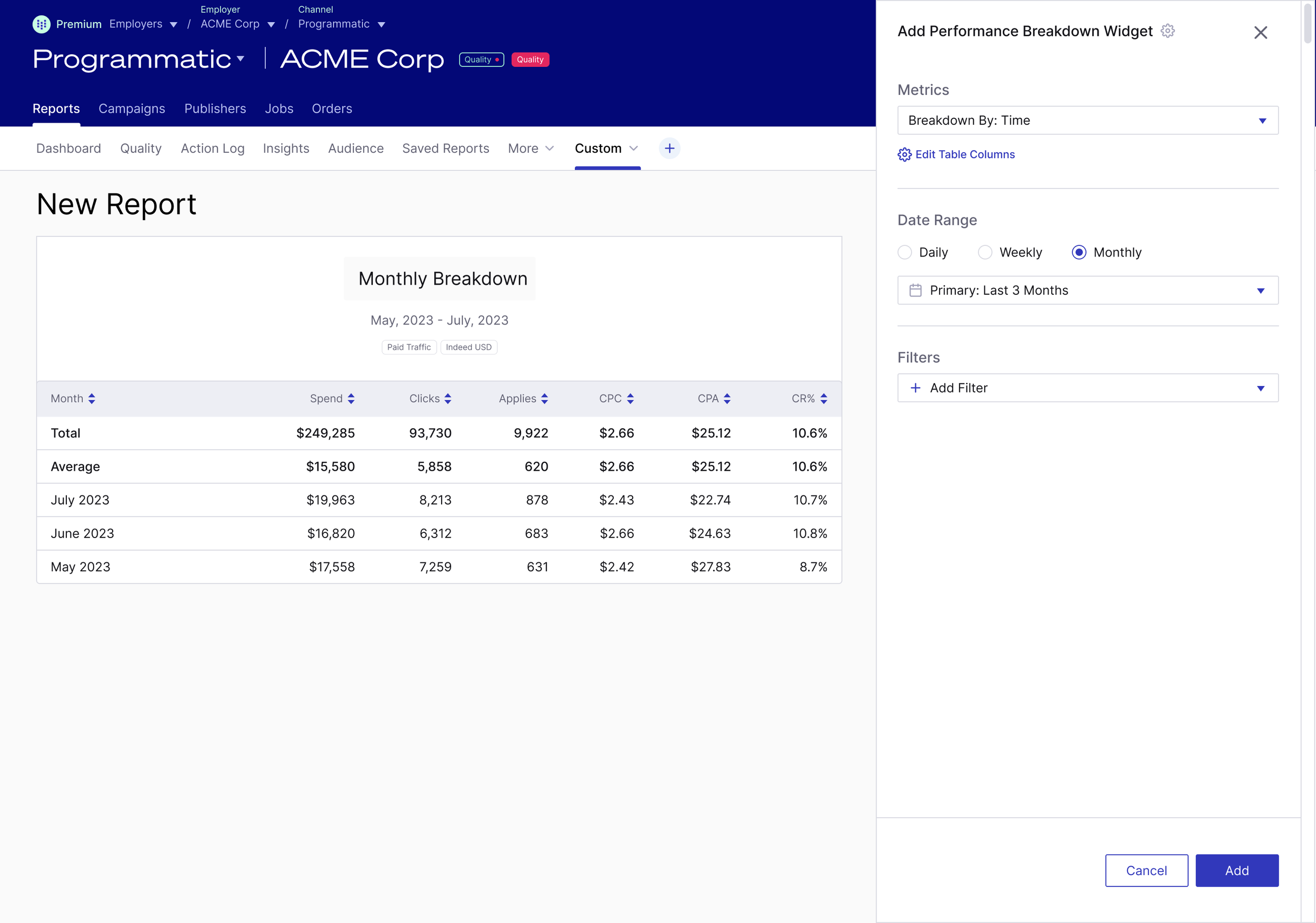 Appcast’s customers wanted Appcast to make hires cheaper and faster. Customers would determine how well Appcast is meeting their goals with performance reporting. Each customer had different circumstances, needs, and demands. Appcast account teams spent 30% of their time creating customized customer-facing reporting in and out of the product. The quality and formatting of the reporting was dramatically inconsistent across customers. The product was too rigid and “one size fits none” for it to fully meet the needs of Appcast account teams and customers.