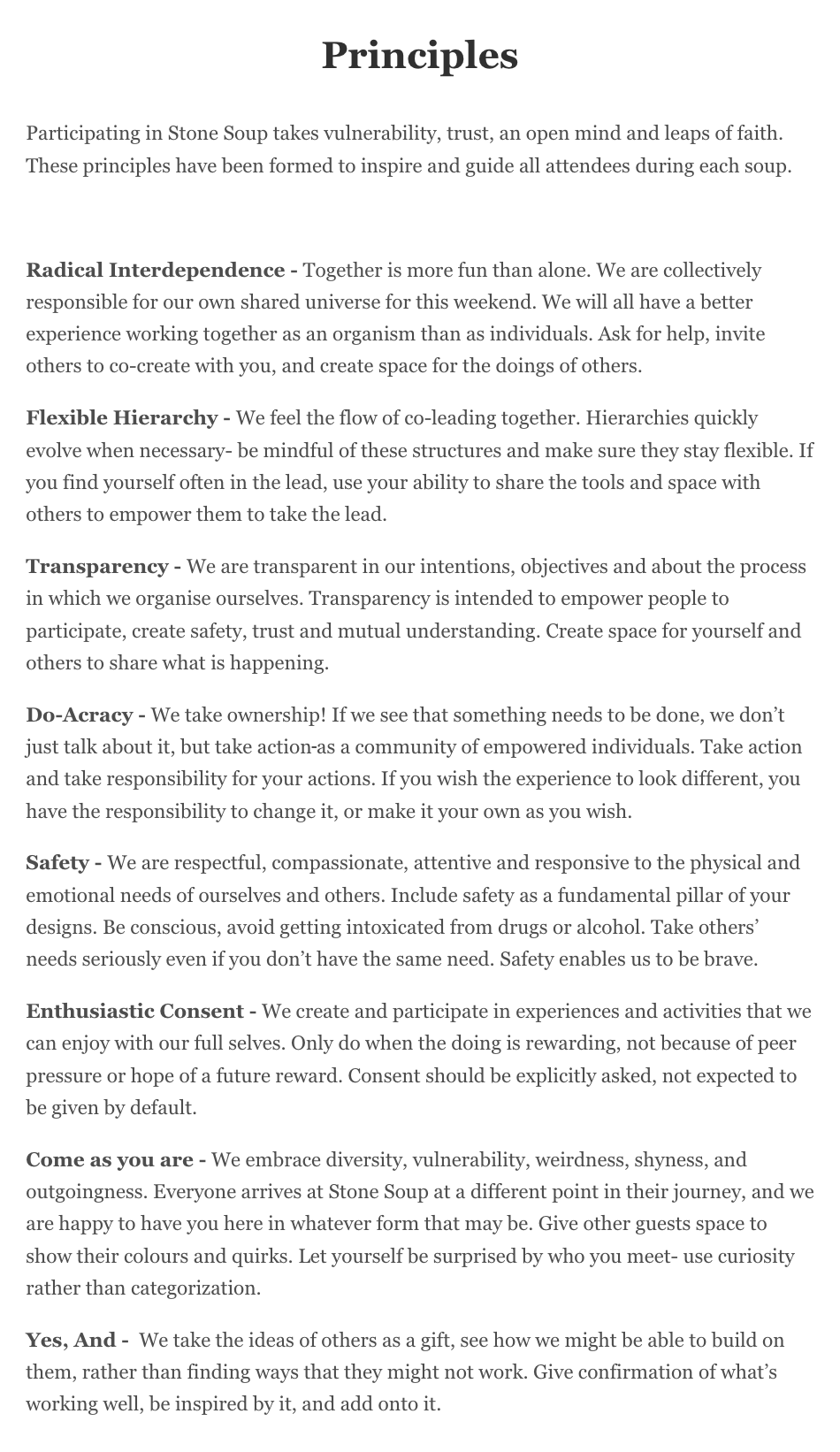 The core group of co-organizers created guiding principles for Stone Soup, one of them being decentralized ownership. However, we gave ourselves 10 weeks to organize first Stone Soup and caught myself doing most of the work to line up the venue, create the website, and make the vision come to life.